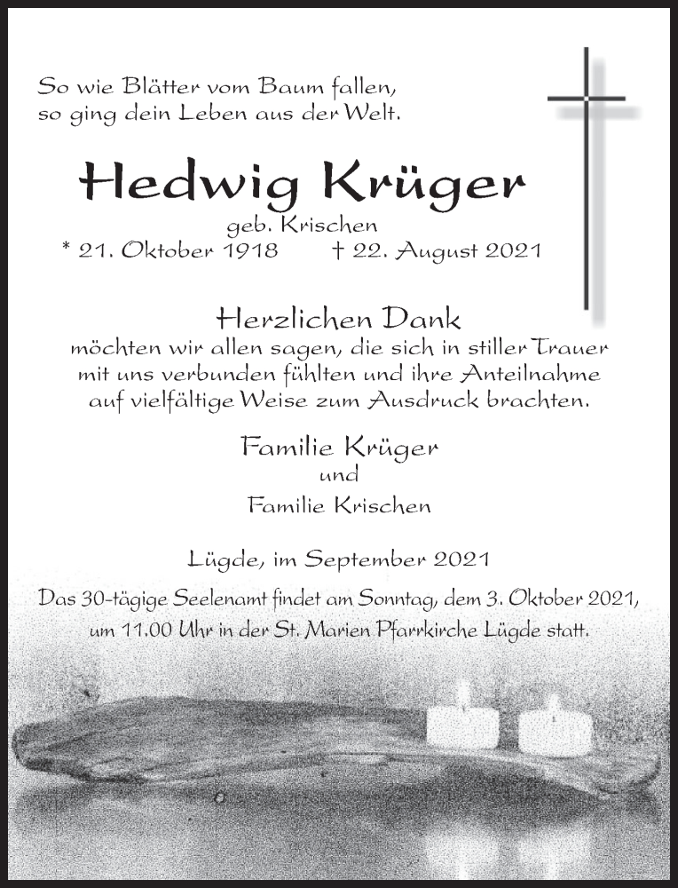 Hier finden Sie alle Traueranzeigen aus der Zeitung, die bisher für Hedwig Krüger erschienen sind. Weitere Traueranzeigen, die in der Zeitung erscheinen, werden hier ebenfalls aufgelistet