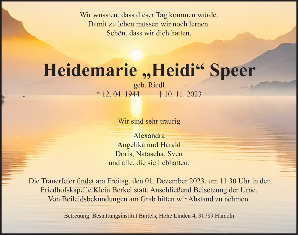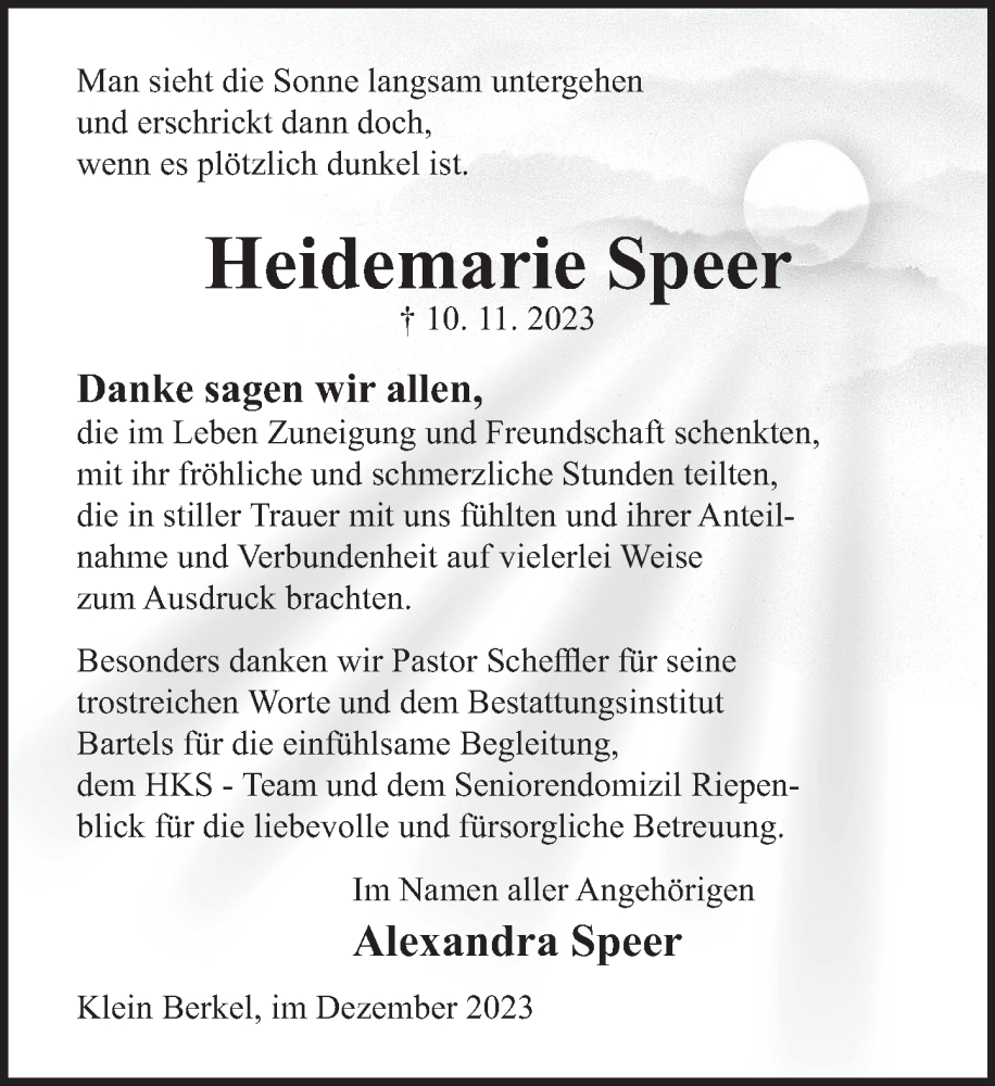 Hier finden Sie alle Traueranzeigen aus der Zeitung, die bisher für Heidemarie Speer erschienen sind. Weitere Traueranzeigen, die in der Zeitung erscheinen, werden hier ebenfalls aufgelistet