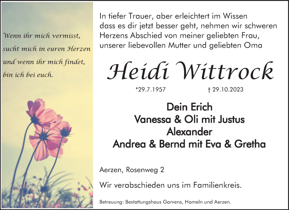 Hier finden Sie alle Traueranzeigen aus der Zeitung, die bisher für Heidi Wittrock erschienen sind. Weitere Traueranzeigen, die in der Zeitung erscheinen, werden hier ebenfalls aufgelistet