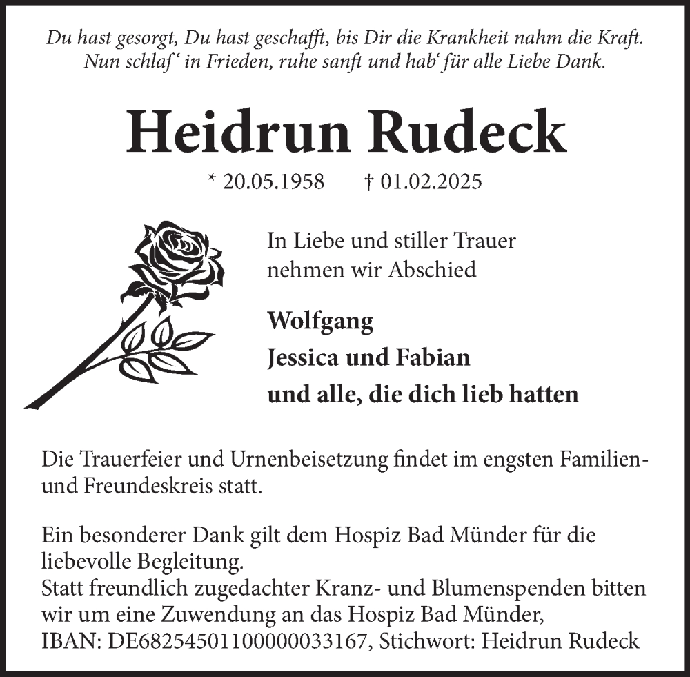 Hier finden Sie alle Traueranzeigen aus der Zeitung, die bisher für Heidrun Rudeck erschienen sind. Weitere Traueranzeigen, die in der Zeitung erscheinen, werden hier ebenfalls aufgelistet