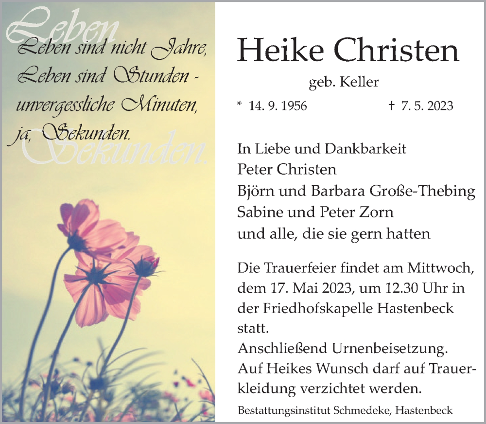Hier finden Sie alle Traueranzeigen aus der Zeitung, die bisher für Heike Christen erschienen sind. Weitere Traueranzeigen, die in der Zeitung erscheinen, werden hier ebenfalls aufgelistet