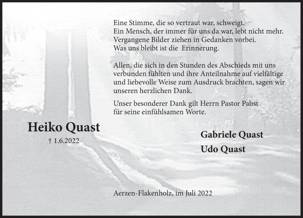 Hier finden Sie alle Traueranzeigen aus der Zeitung, die bisher für Heiko Quast erschienen sind. Weitere Traueranzeigen, die in der Zeitung erscheinen, werden hier ebenfalls aufgelistet
