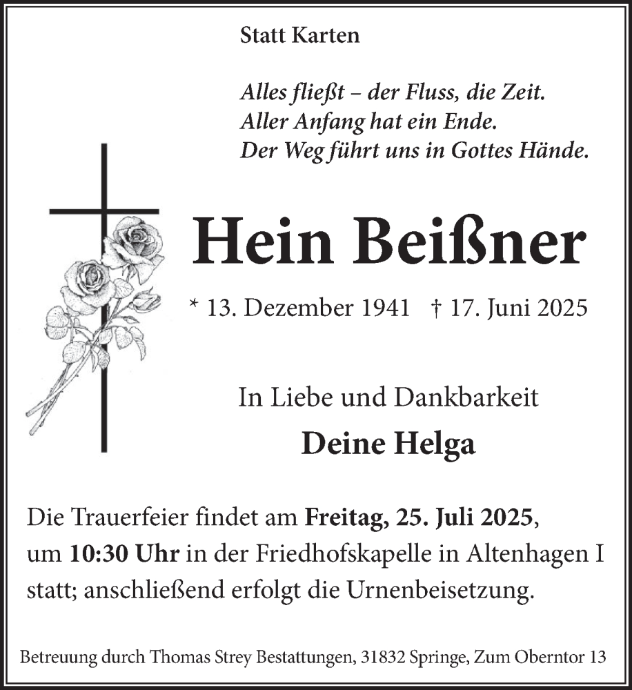 Hier finden Sie alle Traueranzeigen aus der Zeitung, die bisher für Hein Beißner erschienen sind. Weitere Traueranzeigen, die in der Zeitung erscheinen, werden hier ebenfalls aufgelistet