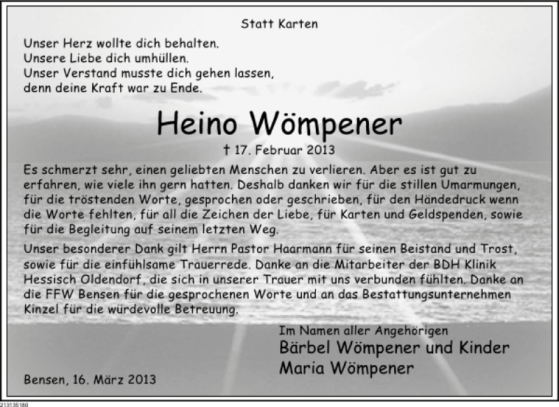 Hier finden Sie alle Traueranzeigen aus der Zeitung, die bisher für Heino Wömpener erschienen sind. Weitere Traueranzeigen, die in der Zeitung erscheinen, werden hier ebenfalls aufgelistet