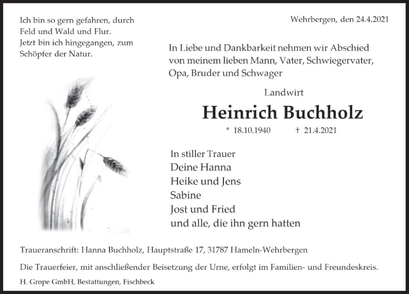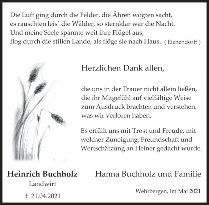 Hier finden Sie alle Traueranzeigen aus der Zeitung, die bisher für Heinrich Buchholz erschienen sind. Weitere Traueranzeigen, die in der Zeitung erscheinen, werden hier ebenfalls aufgelistet
