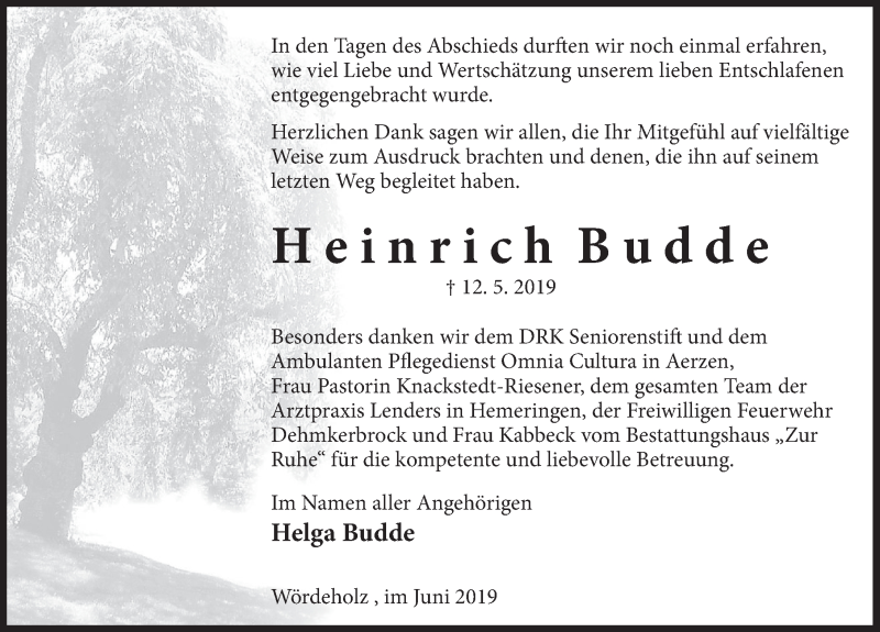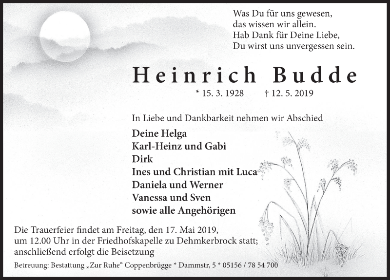 Hier finden Sie alle Traueranzeigen aus der Zeitung, die bisher für Heinrich Budde erschienen sind. Weitere Traueranzeigen, die in der Zeitung erscheinen, werden hier ebenfalls aufgelistet