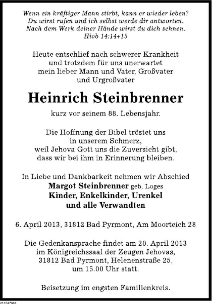 Hier finden Sie alle Traueranzeigen aus der Zeitung, die bisher für Heinrich Steinbrenner erschienen sind. Weitere Traueranzeigen, die in der Zeitung erscheinen, werden hier ebenfalls aufgelistet