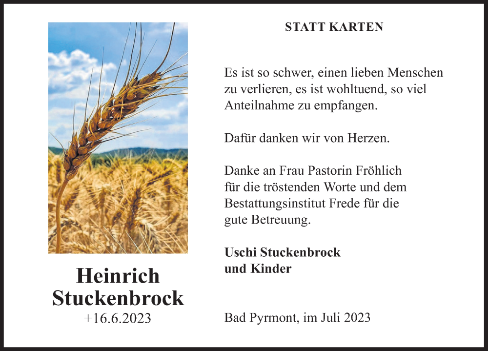 Hier finden Sie alle Traueranzeigen aus der Zeitung, die bisher für Heinrich Stuckenbrock erschienen sind. Weitere Traueranzeigen, die in der Zeitung erscheinen, werden hier ebenfalls aufgelistet