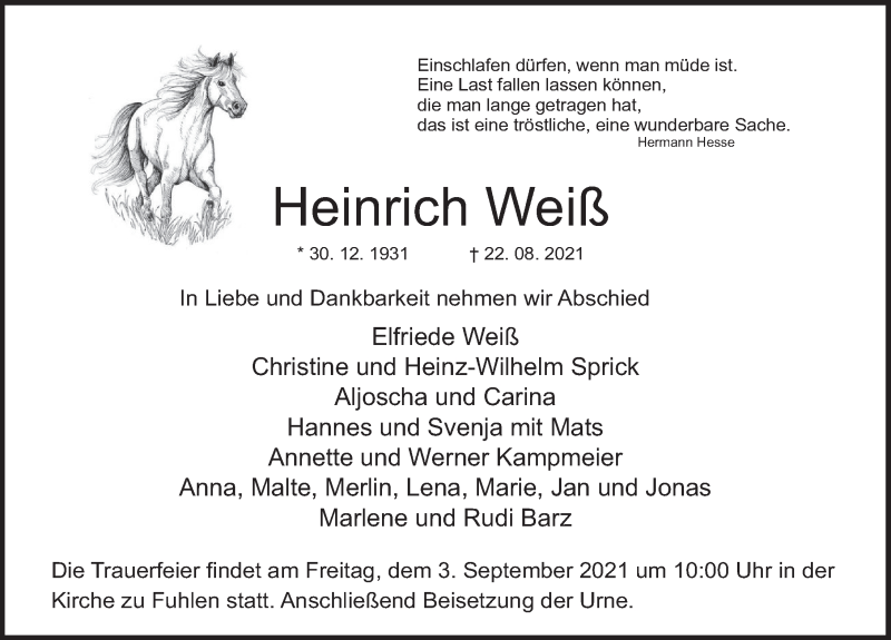 Hier finden Sie alle Traueranzeigen aus der Zeitung, die bisher für Heinrich Weiß erschienen sind. Weitere Traueranzeigen, die in der Zeitung erscheinen, werden hier ebenfalls aufgelistet