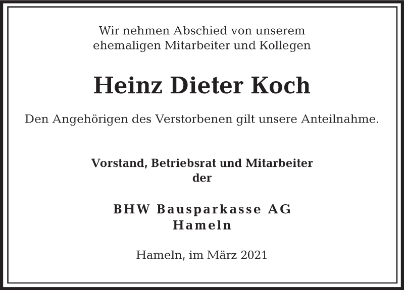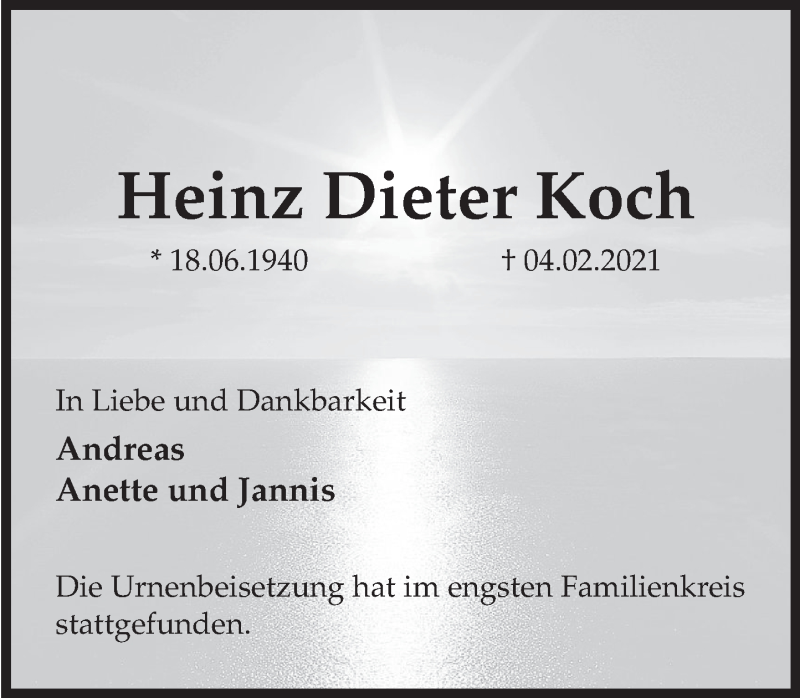 Hier finden Sie alle Traueranzeigen aus der Zeitung, die bisher für Heinz Dieter Koch erschienen sind. Weitere Traueranzeigen, die in der Zeitung erscheinen, werden hier ebenfalls aufgelistet