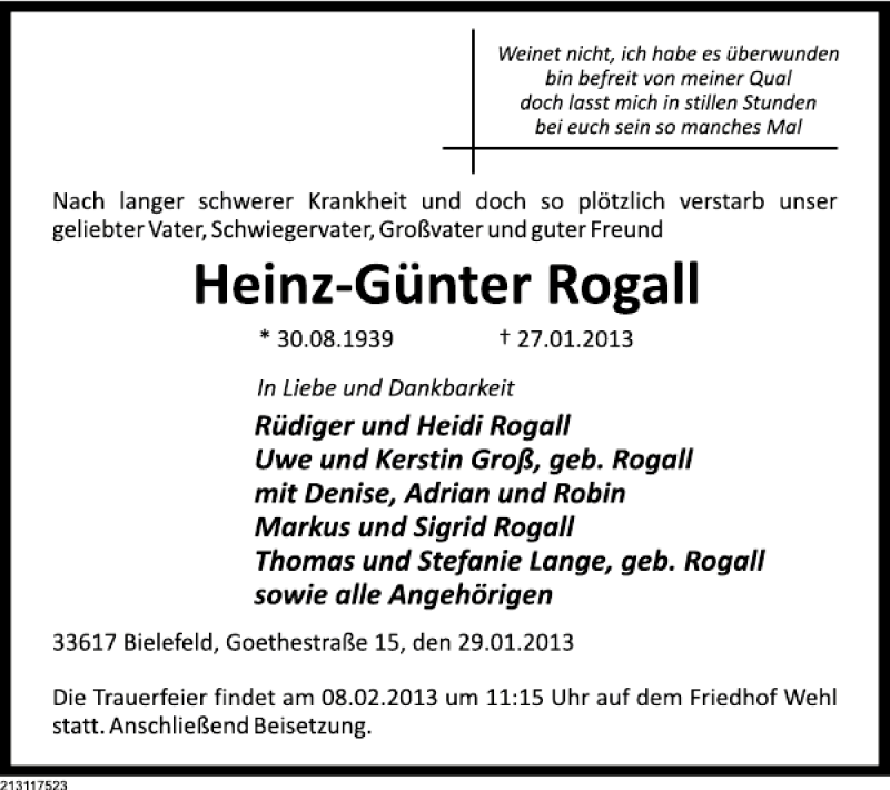 Hier finden Sie alle Traueranzeigen aus der Zeitung, die bisher für Heinz-Günther-Rogall erschienen sind. Weitere Traueranzeigen, die in der Zeitung erscheinen, werden hier ebenfalls aufgelistet