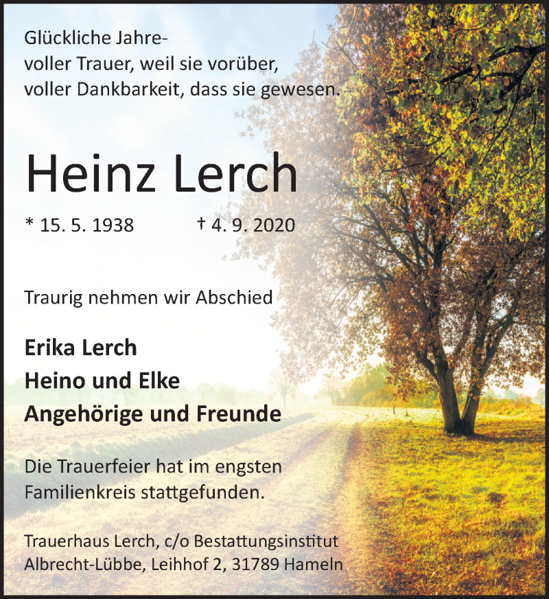 Hier finden Sie alle Traueranzeigen aus der Zeitung, die bisher für Heinz Lerch erschienen sind. Weitere Traueranzeigen, die in der Zeitung erscheinen, werden hier ebenfalls aufgelistet