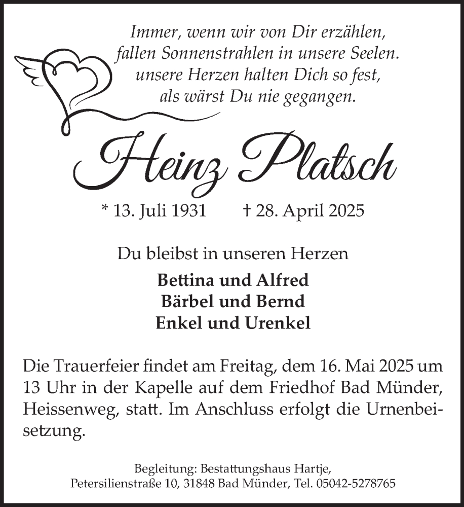 Hier finden Sie alle Traueranzeigen aus der Zeitung, die bisher für Heinz Platsch erschienen sind. Weitere Traueranzeigen, die in der Zeitung erscheinen, werden hier ebenfalls aufgelistet