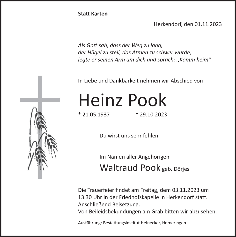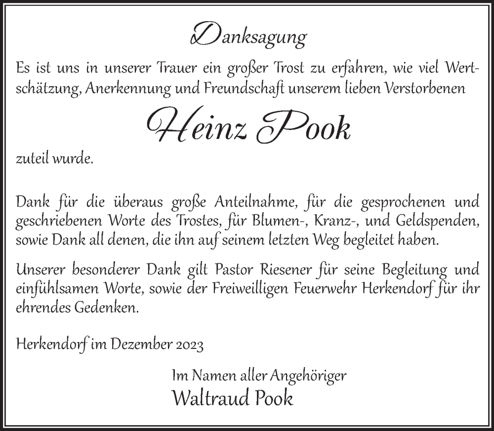 Hier finden Sie alle Traueranzeigen aus der Zeitung, die bisher für Heinz Pook erschienen sind. Weitere Traueranzeigen, die in der Zeitung erscheinen, werden hier ebenfalls aufgelistet