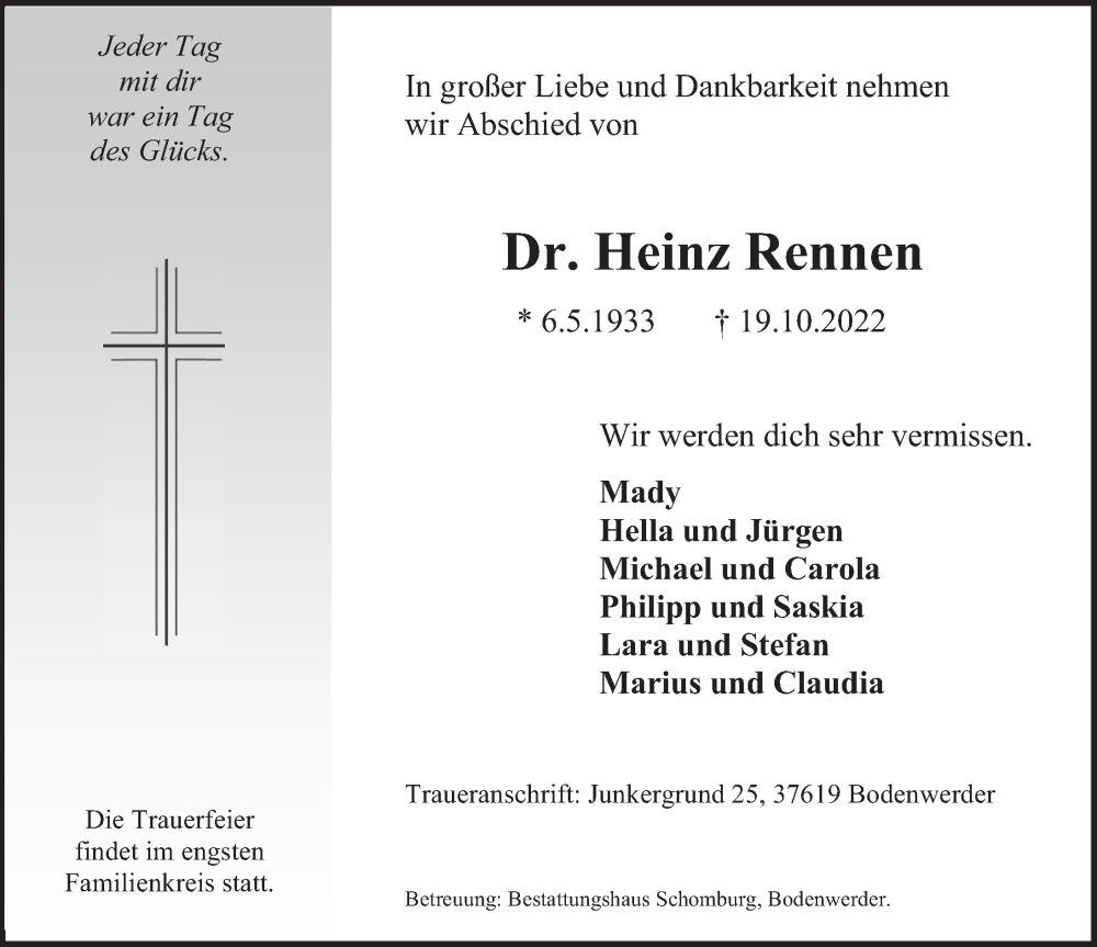 Hier finden Sie alle Traueranzeigen aus der Zeitung, die bisher für Heinz Rennen erschienen sind. Weitere Traueranzeigen, die in der Zeitung erscheinen, werden hier ebenfalls aufgelistet