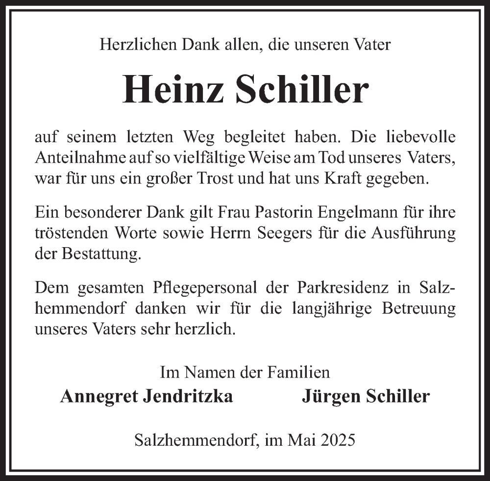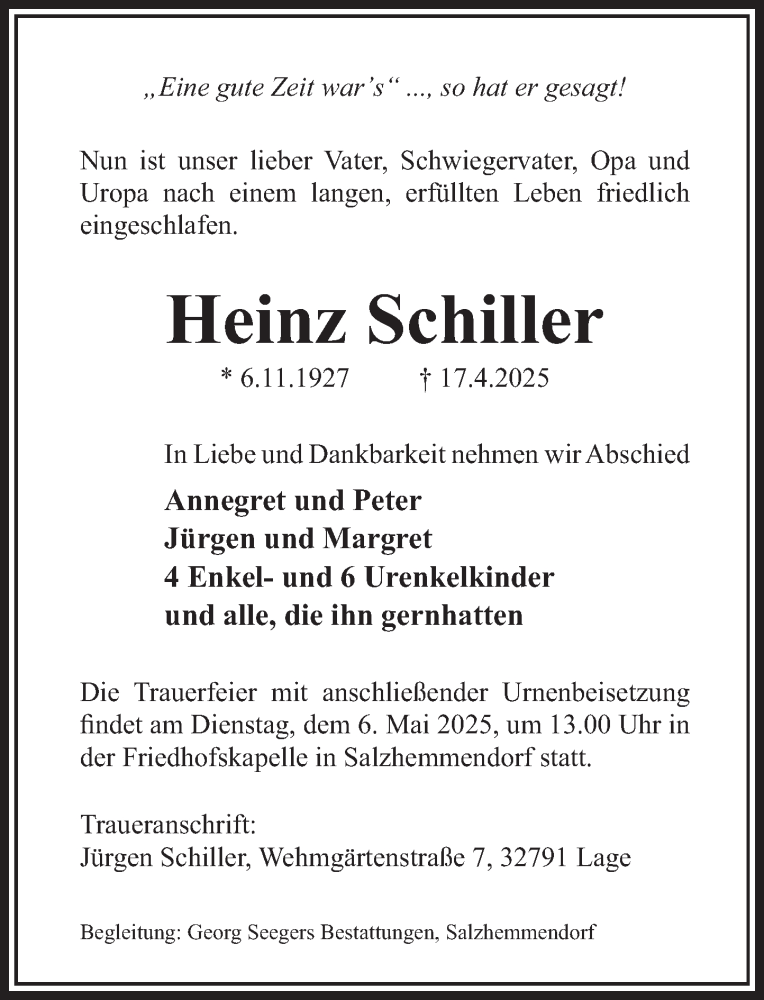 Hier finden Sie alle Traueranzeigen aus der Zeitung, die bisher für Heinz Schiller erschienen sind. Weitere Traueranzeigen, die in der Zeitung erscheinen, werden hier ebenfalls aufgelistet