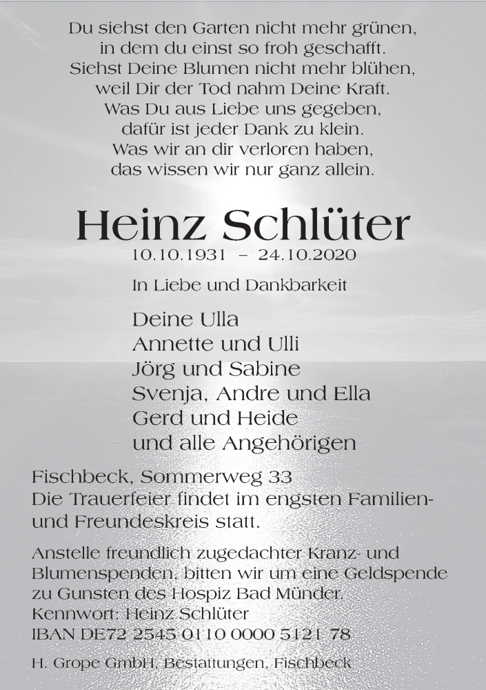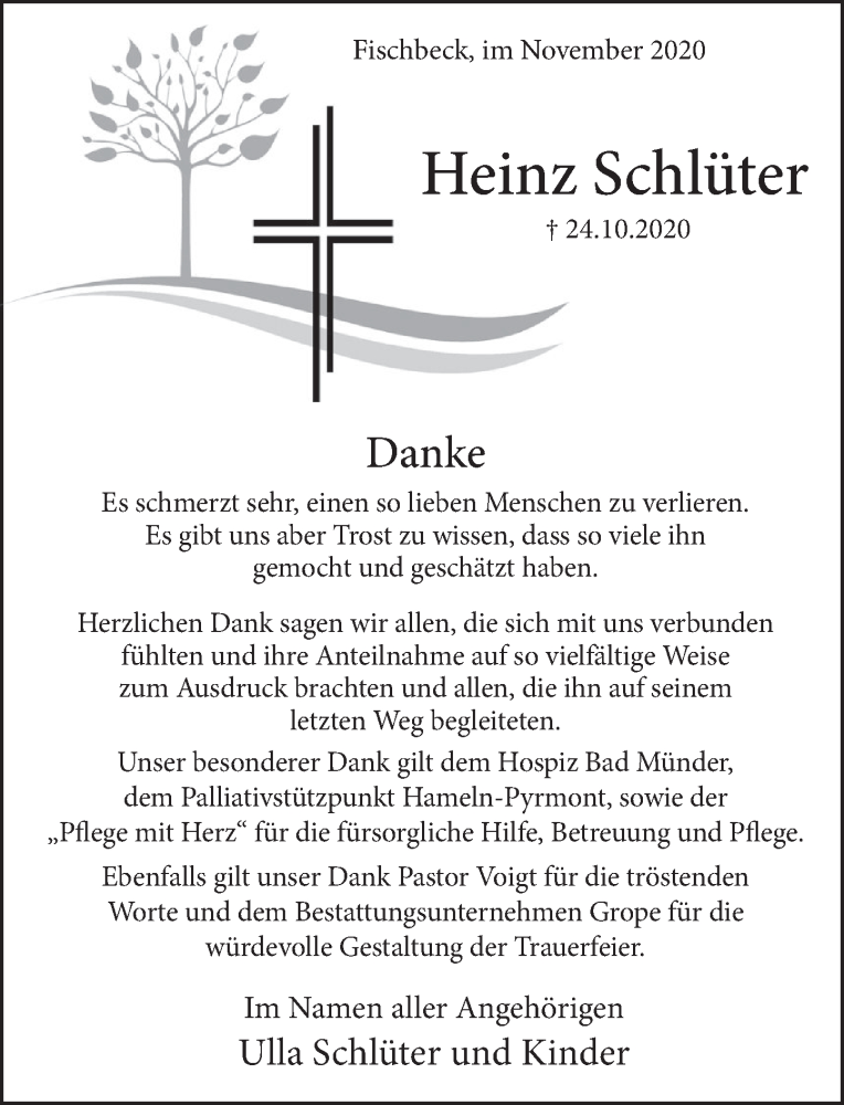 Hier finden Sie alle Traueranzeigen aus der Zeitung, die bisher für Heinz Schlüter erschienen sind. Weitere Traueranzeigen, die in der Zeitung erscheinen, werden hier ebenfalls aufgelistet