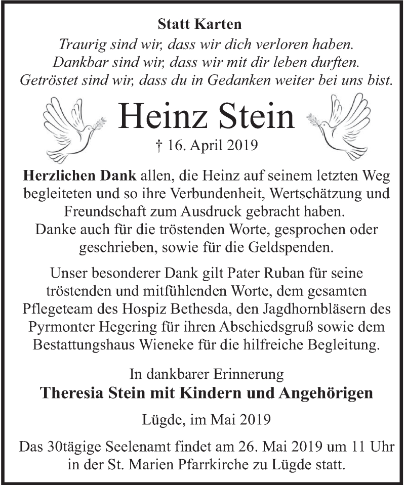 Hier finden Sie alle Traueranzeigen aus der Zeitung, die bisher für Heinz Stein erschienen sind. Weitere Traueranzeigen, die in der Zeitung erscheinen, werden hier ebenfalls aufgelistet