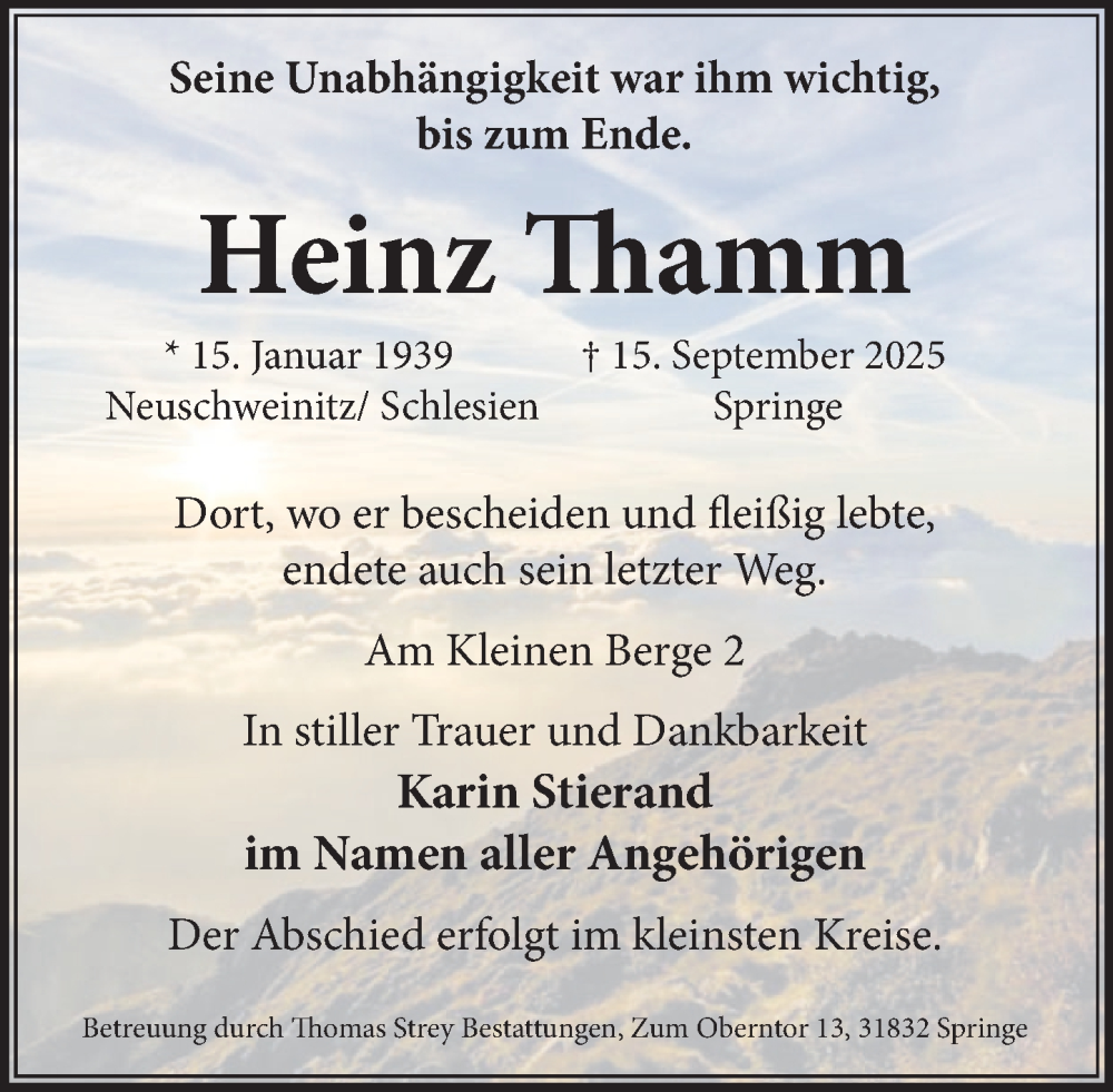 Hier finden Sie alle Traueranzeigen aus der Zeitung, die bisher für Heinz Thamm erschienen sind. Weitere Traueranzeigen, die in der Zeitung erscheinen, werden hier ebenfalls aufgelistet