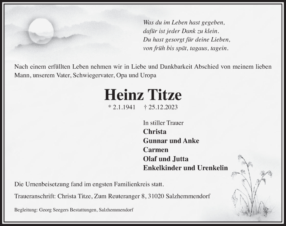 Hier finden Sie alle Traueranzeigen aus der Zeitung, die bisher für Heinz Titze erschienen sind. Weitere Traueranzeigen, die in der Zeitung erscheinen, werden hier ebenfalls aufgelistet