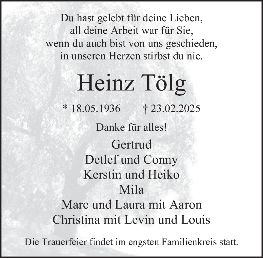 Hier finden Sie alle Traueranzeigen aus der Zeitung, die bisher für Heinz Tölg erschienen sind. Weitere Traueranzeigen, die in der Zeitung erscheinen, werden hier ebenfalls aufgelistet