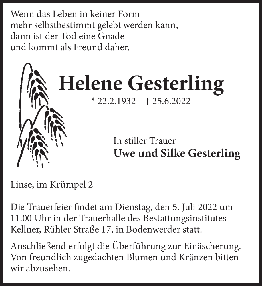 Hier finden Sie alle Traueranzeigen aus der Zeitung, die bisher für Helene Gesterling erschienen sind. Weitere Traueranzeigen, die in der Zeitung erscheinen, werden hier ebenfalls aufgelistet