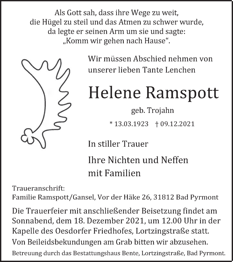 Hier finden Sie alle Traueranzeigen aus der Zeitung, die bisher für Helene Ramspott erschienen sind. Weitere Traueranzeigen, die in der Zeitung erscheinen, werden hier ebenfalls aufgelistet