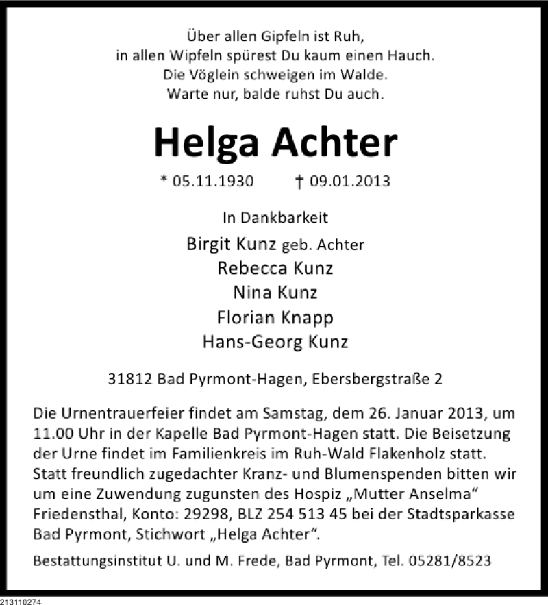 Hier finden Sie alle Traueranzeigen aus der Zeitung, die bisher für Helga Achter erschienen sind. Weitere Traueranzeigen, die in der Zeitung erscheinen, werden hier ebenfalls aufgelistet