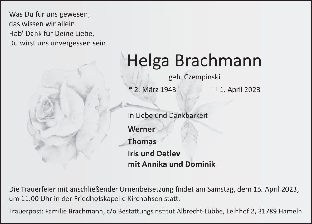 Hier finden Sie alle Traueranzeigen aus der Zeitung, die bisher für Helga Brachmann erschienen sind. Weitere Traueranzeigen, die in der Zeitung erscheinen, werden hier ebenfalls aufgelistet