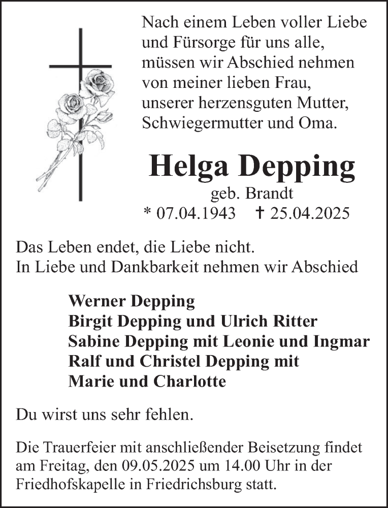 Hier finden Sie alle Traueranzeigen aus der Zeitung, die bisher für Helga Depping erschienen sind. Weitere Traueranzeigen, die in der Zeitung erscheinen, werden hier ebenfalls aufgelistet