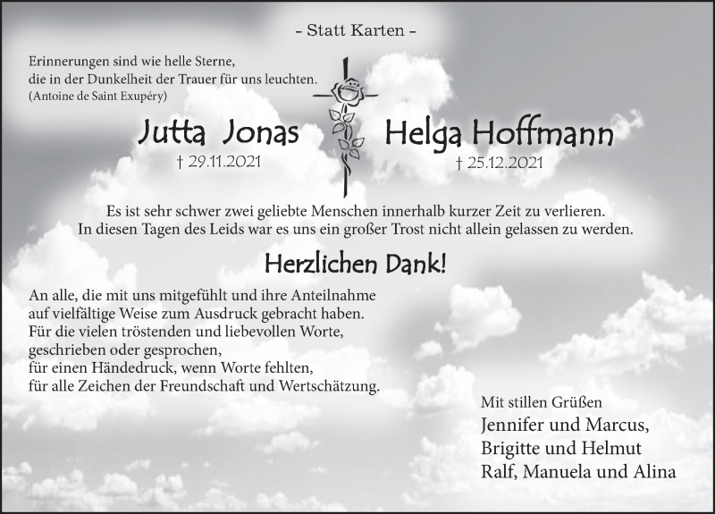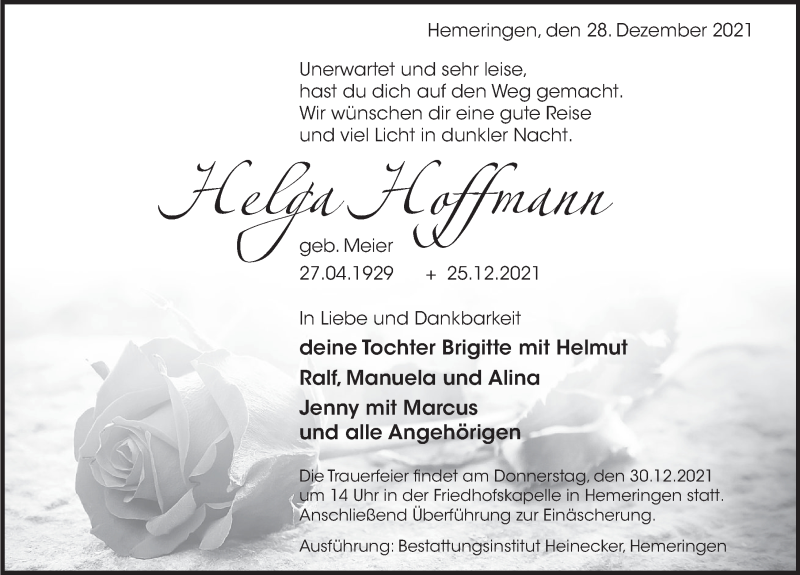 Hier finden Sie alle Traueranzeigen aus der Zeitung, die bisher für Helga Hoffmann erschienen sind. Weitere Traueranzeigen, die in der Zeitung erscheinen, werden hier ebenfalls aufgelistet