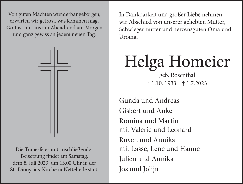 Hier finden Sie alle Traueranzeigen aus der Zeitung, die bisher für Helga Homeier erschienen sind. Weitere Traueranzeigen, die in der Zeitung erscheinen, werden hier ebenfalls aufgelistet