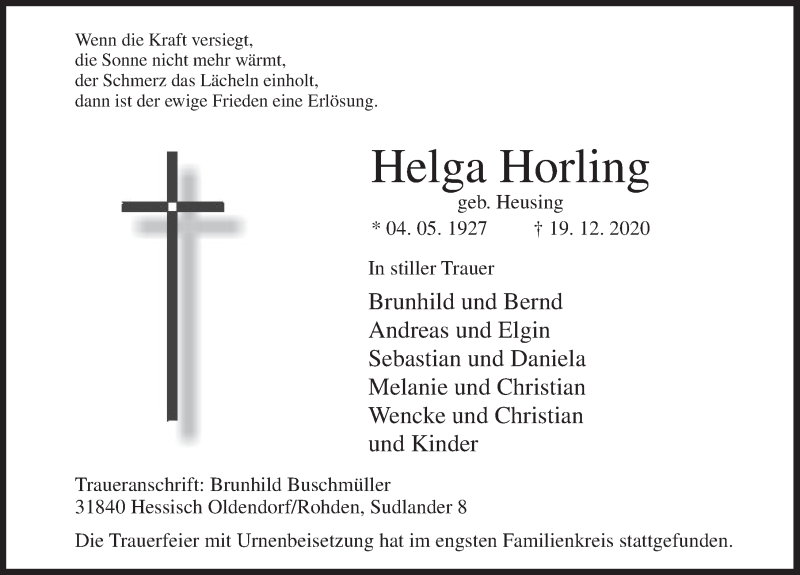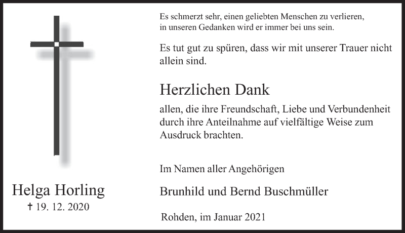 Hier finden Sie alle Traueranzeigen aus der Zeitung, die bisher für Helga Horling erschienen sind. Weitere Traueranzeigen, die in der Zeitung erscheinen, werden hier ebenfalls aufgelistet