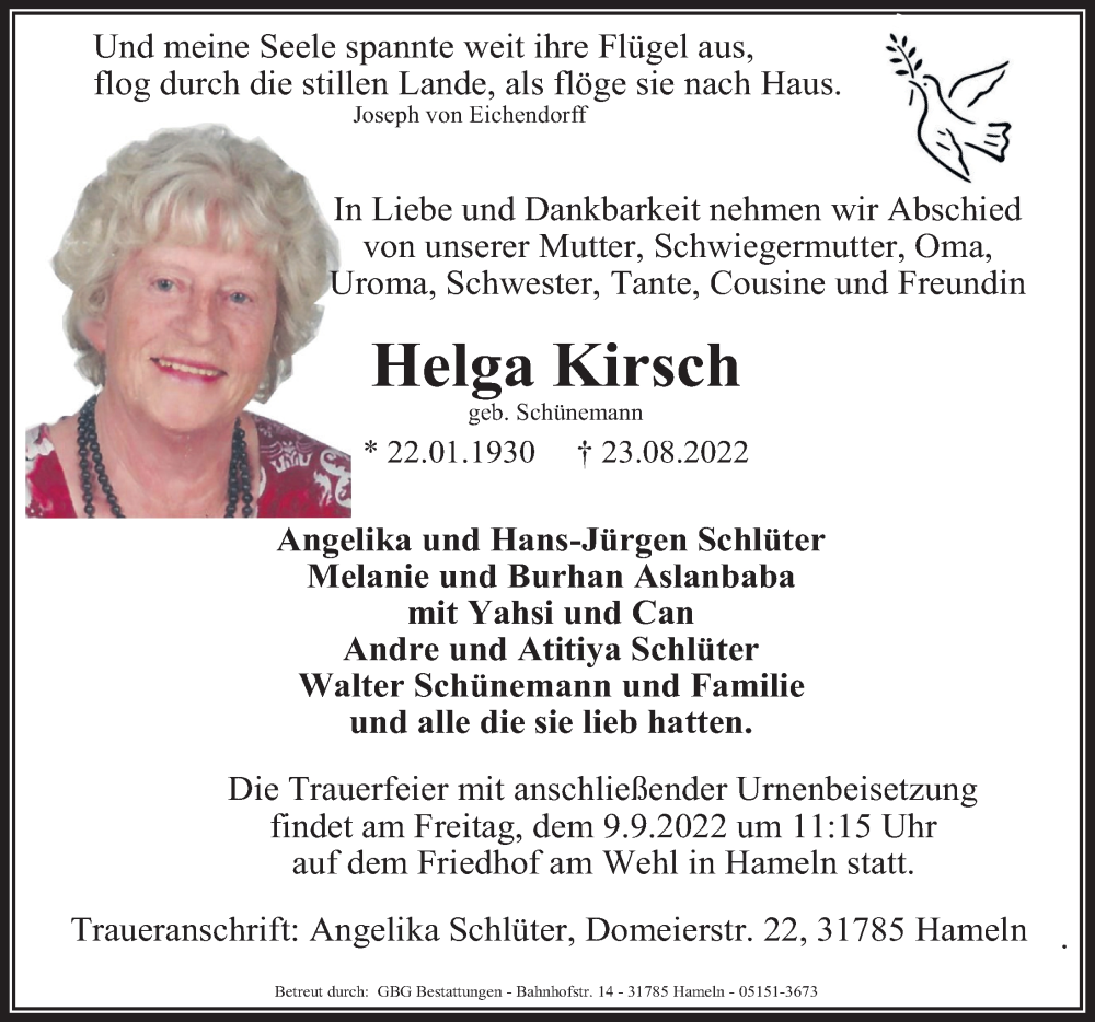 Hier finden Sie alle Traueranzeigen aus der Zeitung, die bisher für Helga Kirsch erschienen sind. Weitere Traueranzeigen, die in der Zeitung erscheinen, werden hier ebenfalls aufgelistet