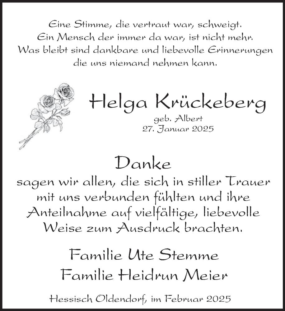 Hier finden Sie alle Traueranzeigen aus der Zeitung, die bisher für Helga Krückeberg erschienen sind. Weitere Traueranzeigen, die in der Zeitung erscheinen, werden hier ebenfalls aufgelistet