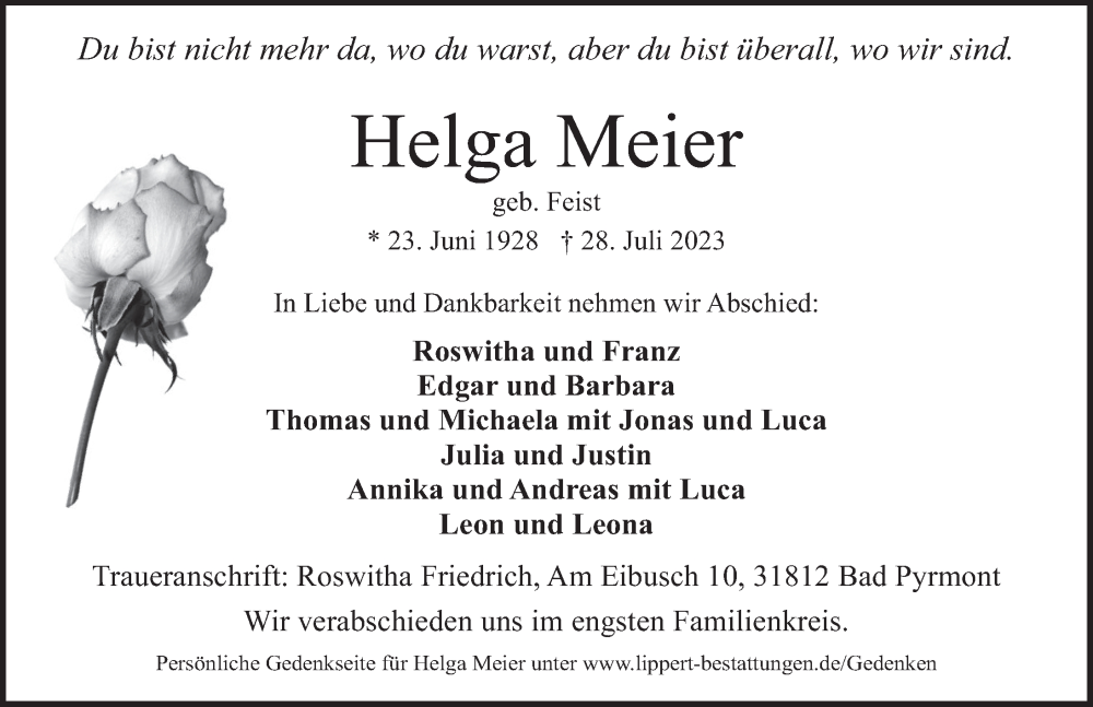 Hier finden Sie alle Traueranzeigen aus der Zeitung, die bisher für Helga Meier erschienen sind. Weitere Traueranzeigen, die in der Zeitung erscheinen, werden hier ebenfalls aufgelistet