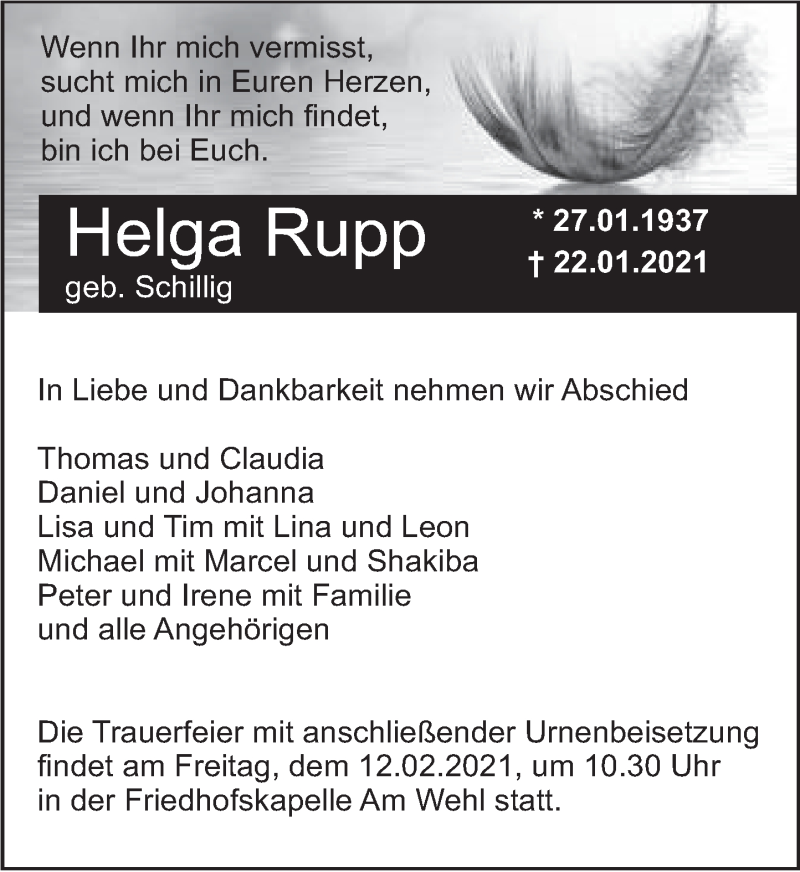Hier finden Sie alle Traueranzeigen aus der Zeitung, die bisher für Helga Rupp erschienen sind. Weitere Traueranzeigen, die in der Zeitung erscheinen, werden hier ebenfalls aufgelistet
