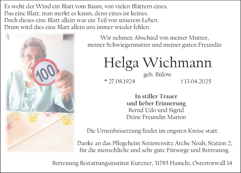 Hier finden Sie alle Traueranzeigen aus der Zeitung, die bisher für Helga Wichmann erschienen sind. Weitere Traueranzeigen, die in der Zeitung erscheinen, werden hier ebenfalls aufgelistet