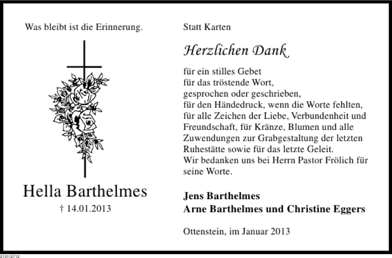 Hier finden Sie alle Traueranzeigen aus der Zeitung, die bisher für Hella Barthelmes erschienen sind. Weitere Traueranzeigen, die in der Zeitung erscheinen, werden hier ebenfalls aufgelistet