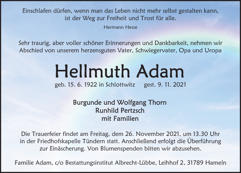 Hier finden Sie alle Traueranzeigen aus der Zeitung, die bisher für Hellmuth Adam erschienen sind. Weitere Traueranzeigen, die in der Zeitung erscheinen, werden hier ebenfalls aufgelistet