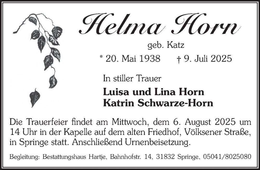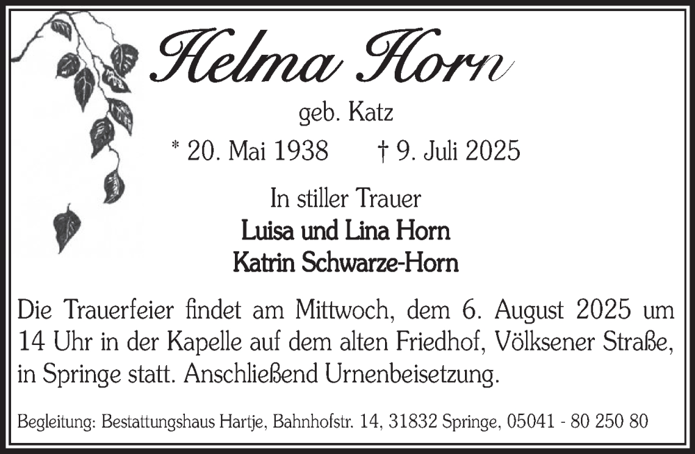 Hier finden Sie alle Traueranzeigen aus der Zeitung, die bisher für Helma Horn erschienen sind. Weitere Traueranzeigen, die in der Zeitung erscheinen, werden hier ebenfalls aufgelistet