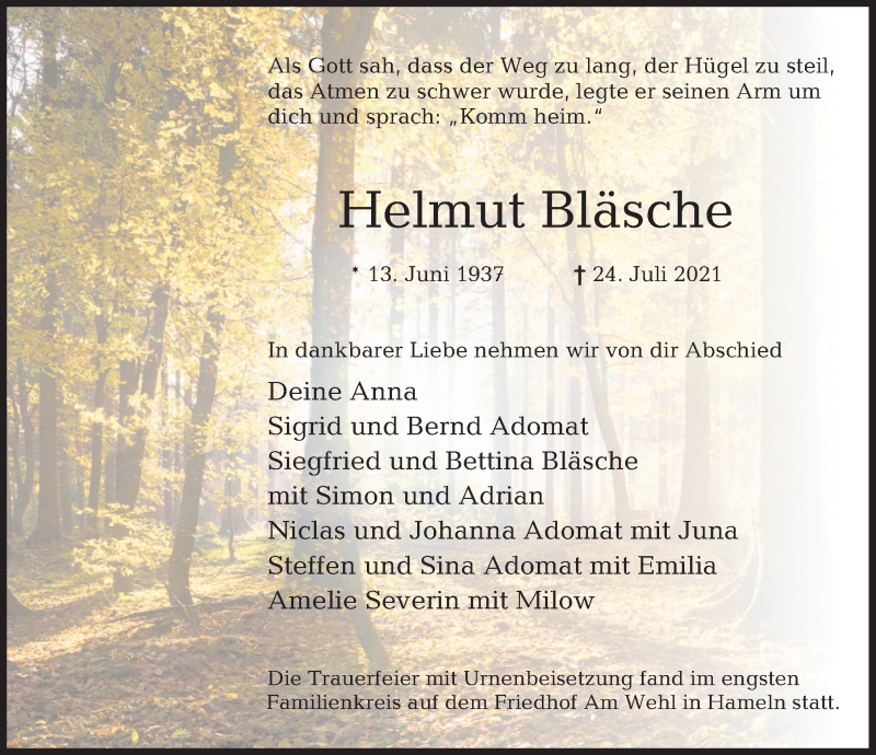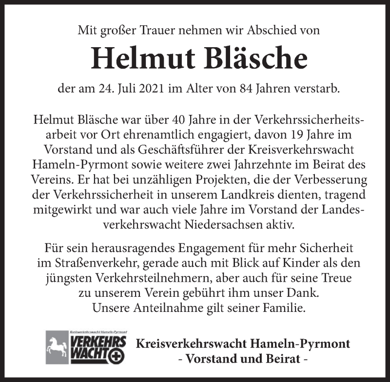 Hier finden Sie alle Traueranzeigen aus der Zeitung, die bisher für Helmut Bläsche erschienen sind. Weitere Traueranzeigen, die in der Zeitung erscheinen, werden hier ebenfalls aufgelistet