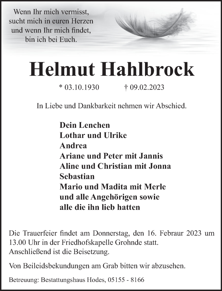 Hier finden Sie alle Traueranzeigen aus der Zeitung, die bisher für Helmut Hahlbrock erschienen sind. Weitere Traueranzeigen, die in der Zeitung erscheinen, werden hier ebenfalls aufgelistet