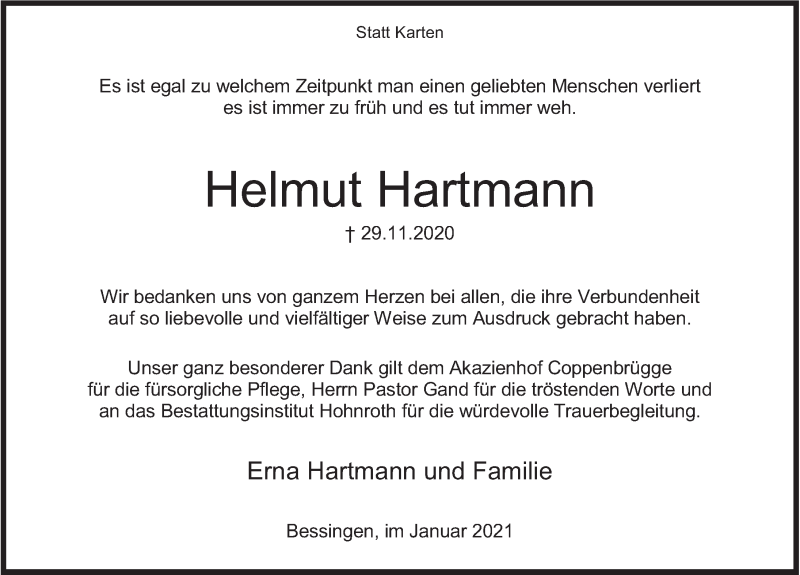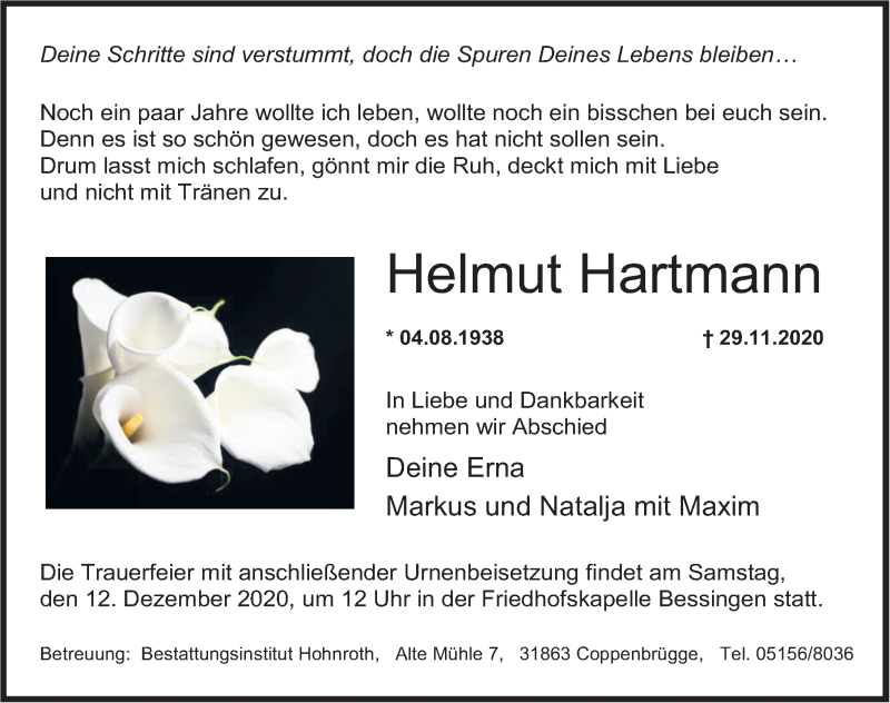 Hier finden Sie alle Traueranzeigen aus der Zeitung, die bisher für Helmut Hartmann erschienen sind. Weitere Traueranzeigen, die in der Zeitung erscheinen, werden hier ebenfalls aufgelistet