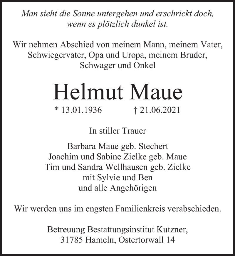 Hier finden Sie alle Traueranzeigen aus der Zeitung, die bisher für Helmut Maue erschienen sind. Weitere Traueranzeigen, die in der Zeitung erscheinen, werden hier ebenfalls aufgelistet