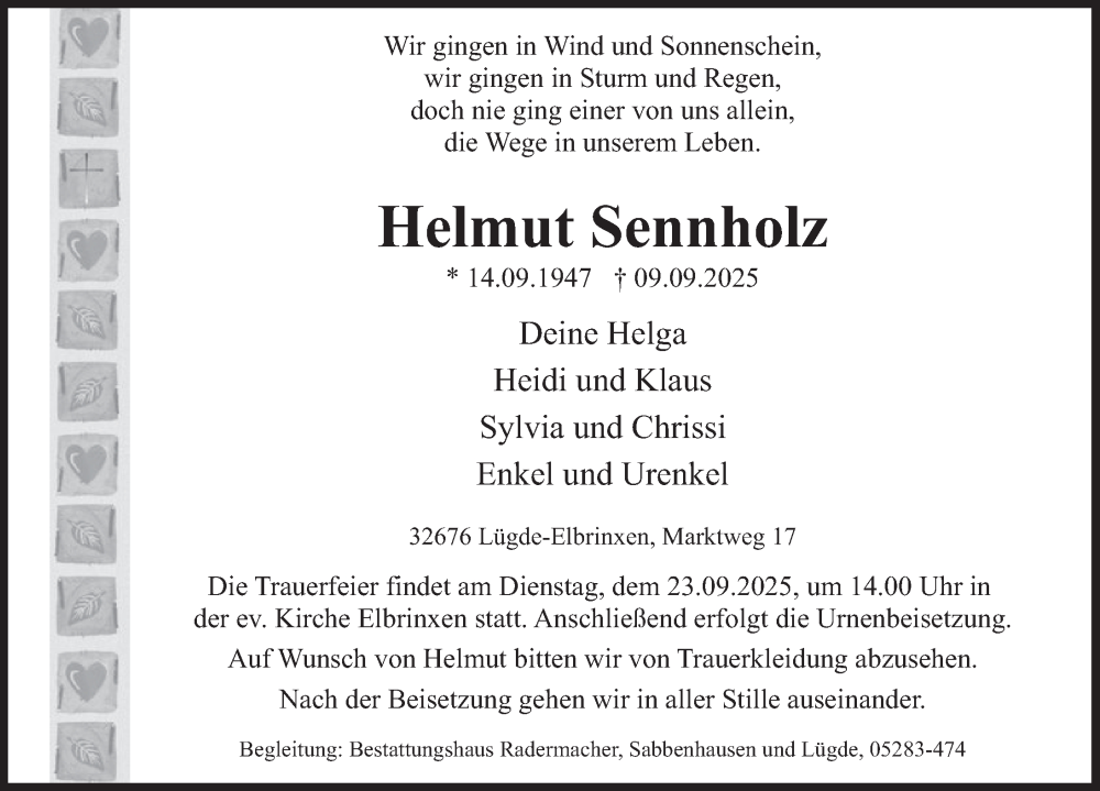 Hier finden Sie alle Traueranzeigen aus der Zeitung, die bisher für Helmut Sennholz erschienen sind. Weitere Traueranzeigen, die in der Zeitung erscheinen, werden hier ebenfalls aufgelistet