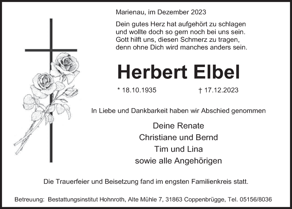 Hier finden Sie alle Traueranzeigen aus der Zeitung, die bisher für Herbert Elbel erschienen sind. Weitere Traueranzeigen, die in der Zeitung erscheinen, werden hier ebenfalls aufgelistet