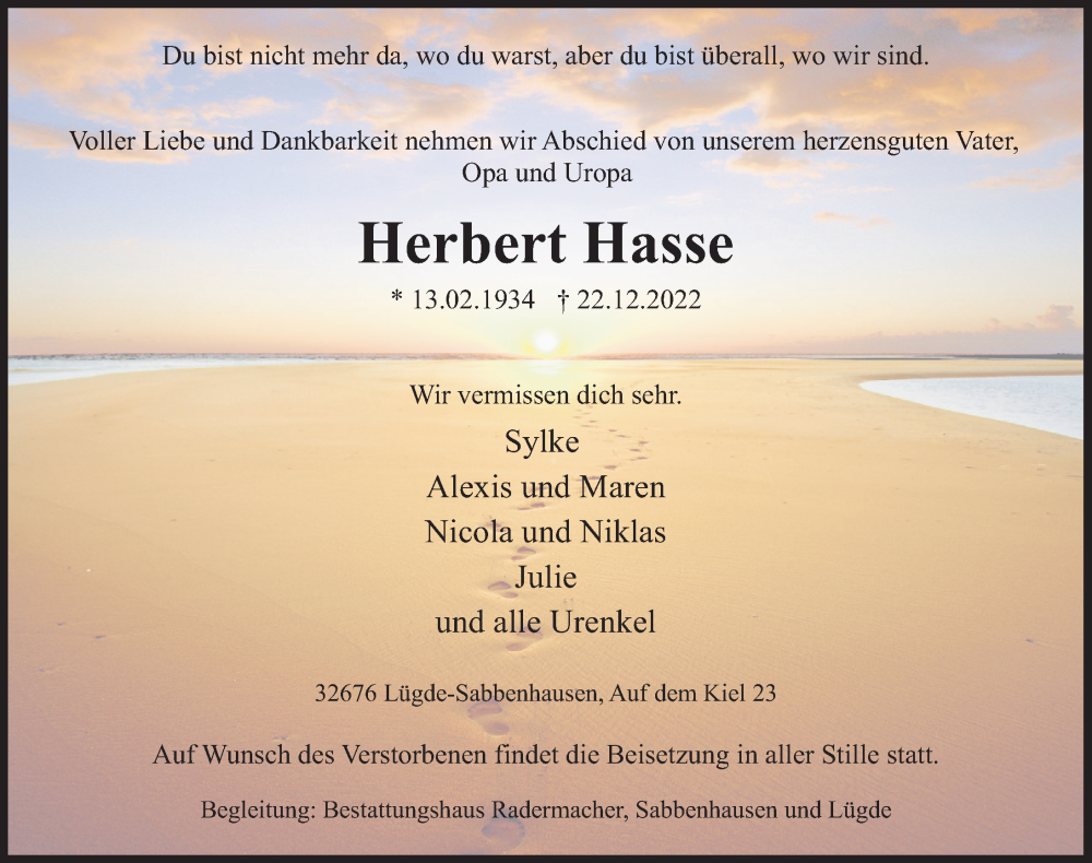 Hier finden Sie alle Traueranzeigen aus der Zeitung, die bisher für Herbert Hasse erschienen sind. Weitere Traueranzeigen, die in der Zeitung erscheinen, werden hier ebenfalls aufgelistet