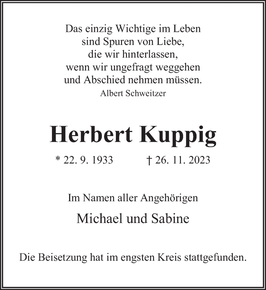 Hier finden Sie alle Traueranzeigen aus der Zeitung, die bisher für Herbert Kuppig erschienen sind. Weitere Traueranzeigen, die in der Zeitung erscheinen, werden hier ebenfalls aufgelistet