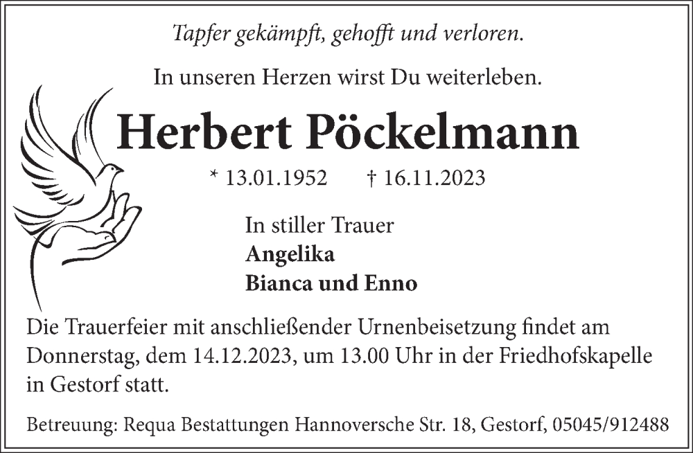 Hier finden Sie alle Traueranzeigen aus der Zeitung, die bisher für Herbert Pöckelmann erschienen sind. Weitere Traueranzeigen, die in der Zeitung erscheinen, werden hier ebenfalls aufgelistet